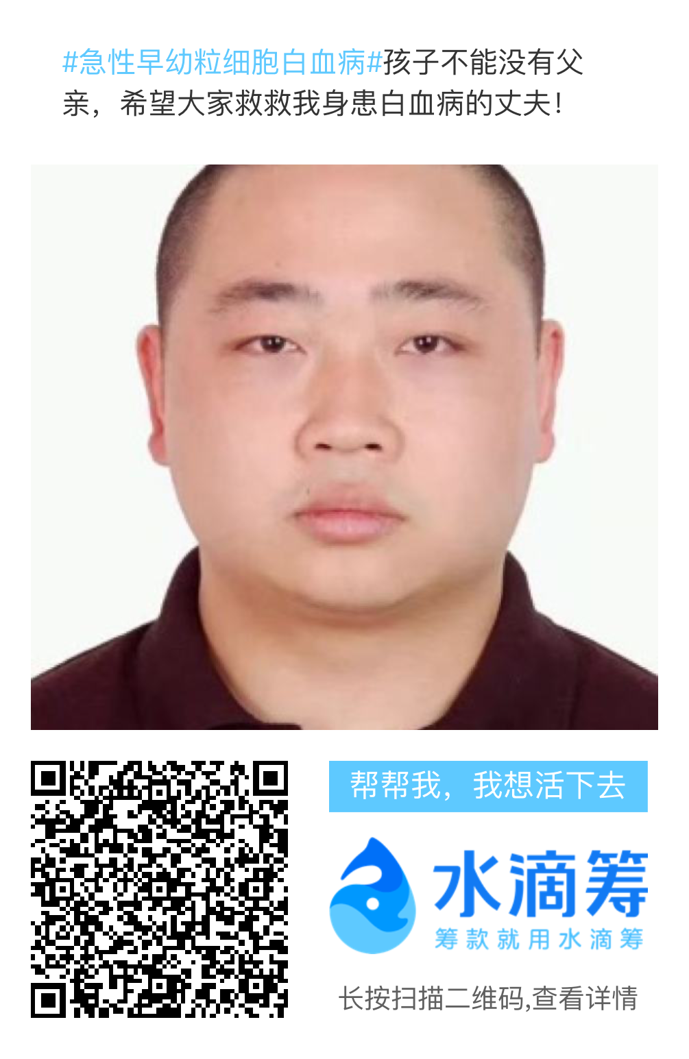 吳鵬,38歲,北京京城皮膚醫(yī)院中藥房職工。去年底剛有了個(gè)可愛的兒子,一家人本應(yīng)該其樂融融的享受美好生活,誰知天有不測(cè)風(fēng)云,在5月3號(hào)被查出了“急性早幼粒細(xì)胞白血病”,歡喜未過卻要面對(duì)如此殘酷慘痛的事實(shí),給本就不富裕的家庭,添上了更為沉重的負(fù)擔(dān)。