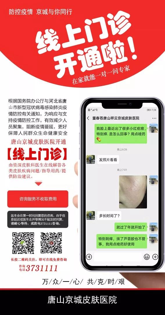 自新冠肺炎防疫工作開展以來,唐山京城皮膚醫(yī)院積極響應上級部門的防“疫”號召,為減少患者交叉感染風險,醫(yī)院特別開通皮膚病《線上門診》、郵寄藥品等服務。皮膚病患者只需長按下圖中的二維碼,足不出戶即可輕松與專家“一對一”線上交流,了解病情,獲得專業(yè)科學的防治建議。