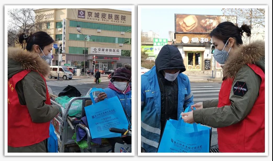 2月20日上午,唐山京城皮膚醫(yī)院黨員志愿者們,為醫(yī)院周邊堅守在路上清掃路面、鏟除積雪的環(huán)衛(wèi)工人,每人贈送10片一次性口罩,感謝他們?yōu)榱顺鞘械母蓛粽麧崳谝咔橹幸廊粓允貚徫?,叮囑他們做好防護措施,注意身體!