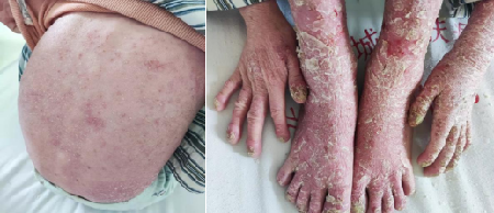 經(jīng)過(guò)一段時(shí)間的治療,小韋紡的病情得到有效控制,目前皮損情況已基本痊愈:雙眼瞼無(wú)外翻、無(wú)充血,全身未見(jiàn)明顯膿皰;頭面部、軀干四肢原有皮損消退約90%;但軀干足底仍可見(jiàn)新起粟粒大小的紅丘疹、小水皰;且四肢皮膚較干燥粗糙,并伴少許鱗屑,而瘙癢評(píng)分已降為1-2分。