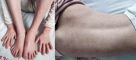 2月25日,醫(yī)院立即組織專(zhuān)家進(jìn)行中西醫(yī)全面會(huì)診,包括醫(yī)院特需專(zhuān)家:北京協(xié)和醫(yī)院原皮膚科主任王家璧教授、北京安貞醫(yī)院原皮膚科主任殷致宇教授、北京大學(xué)人民醫(yī)院主任醫(yī)師張文娟教授、中日友好醫(yī)院中西醫(yī)結(jié)合主任醫(yī)師宋佩華教授等。經(jīng)會(huì)診,專(zhuān)家們發(fā)現(xiàn),小韋紡的皮損面積高達(dá)95%,如頭面部、四肢軀干、臀部及隱私部位均被銀屑病皮損覆蓋。同時(shí),醫(yī)生發(fā)現(xiàn)小韋紡還患有特應(yīng)性皮炎,病情十分復(fù)雜。